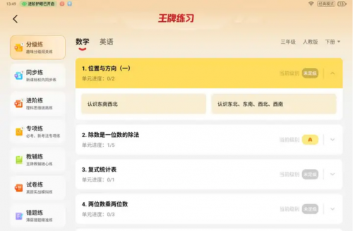 在练习体系构建上,学而思学习机内置16亿题库、超3200册教辅数量、超200万套真题套卷,还创新打造了覆盖全学段的七步阶梯练模式。通过科学分层与精准适配,满足不同学情孩子的高效训练需求。例如,分级练采用阶梯闯关形式,由易到难引导孩子循序渐进提升解题自信,同时培养练题兴趣。