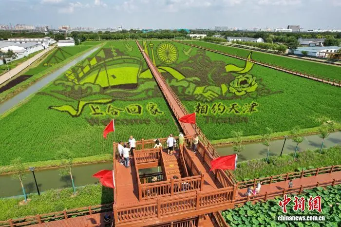 7月31日,游客在天津市津南小站镇会馆村农田观景平台观赏稻田画。近日,以“上合回家·相约天津”为主题的巨型稻田画,经过一个多月生长期完整亮相。该稻田画占地53亩,通过红、黄、白、紫、绿5色秧苗,将天津深厚的人文底蕴及秀美的生态风貌相融合,展现出一幅秀美画卷。(无人机照片)中新社记者 佟郁 摄