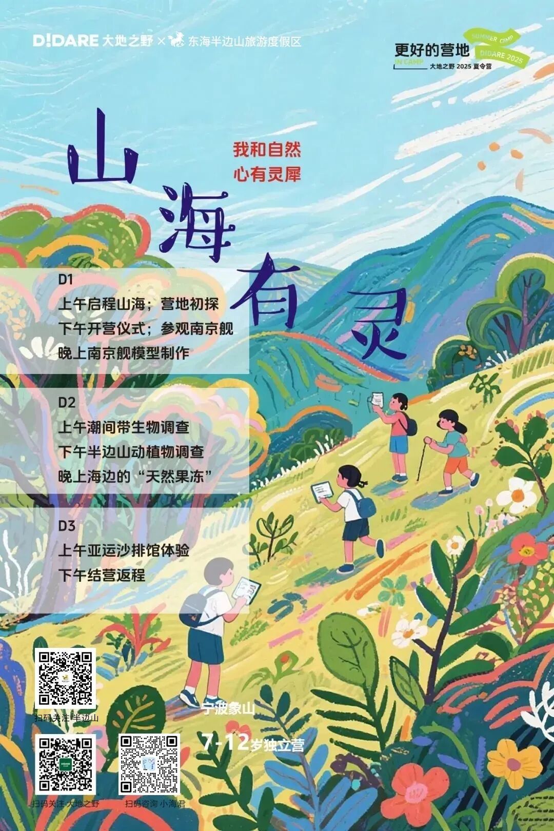 这一次我们选在宁波半边山,就是看重了这里有山有海,可以赶海可以进山,身披火焰一头扎进海里或者山里。除此之外,还能参观到一位护国老英雄南京舰,去海边潮间带调查生物多样性并收集海石花,去山里动植物探索并寻找薜荔,再用它们做成天然果冻,品尝海的味道,能去世界前十的亚运沙排馆体验海风烈日下的青春,像《排球少年》中的主角日向翔阳那样。