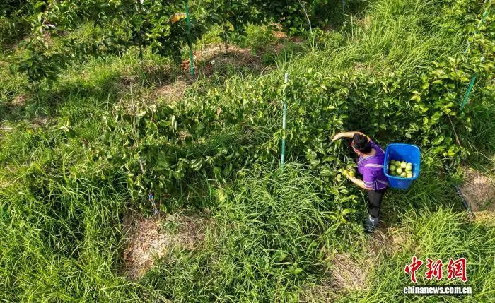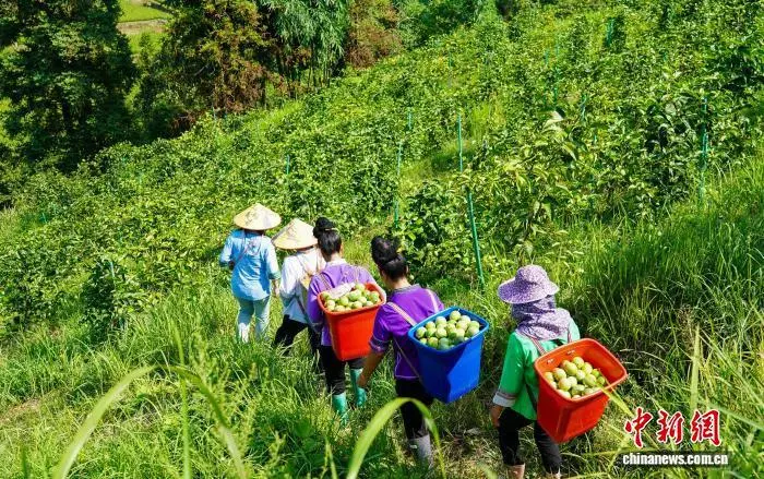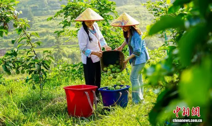 连日来,贵州省黔东南苗族侗族自治州从江县百香果陆续到了成熟采摘期,各地果农抢抓农时,采摘鲜果供应市场。图为8月3日,在从江县丙梅街道的丙梅三村百香果种植基地,果农在采摘新鲜百香果。卢忠南 摄