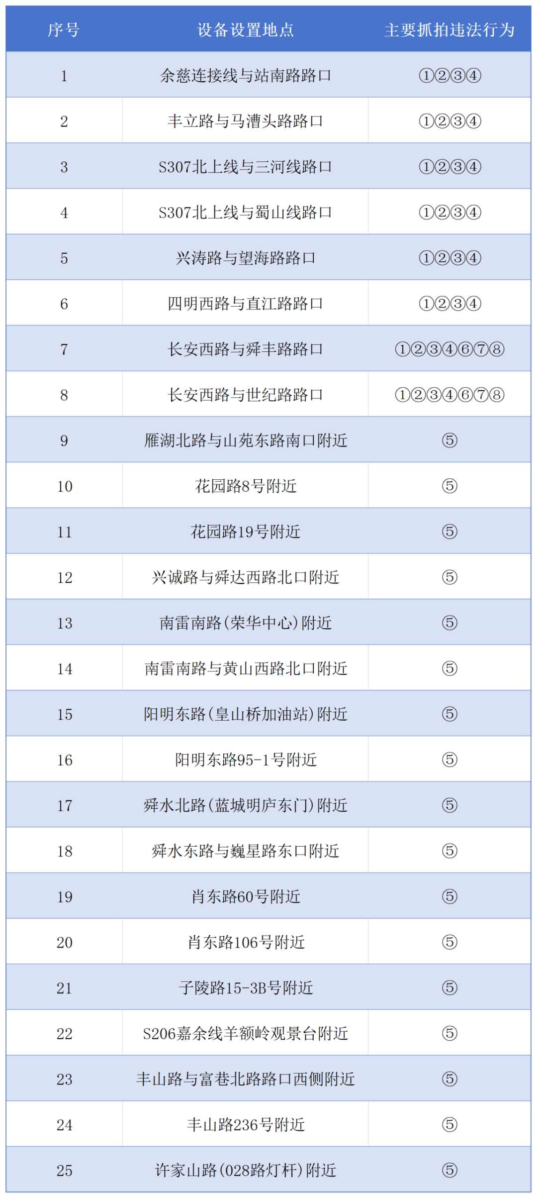 同样是8月8日起,余姚市公安机关交通管理部门将复用、启用一批固定式交通技术监控设备,对以下交通违法行为进行抓拍: