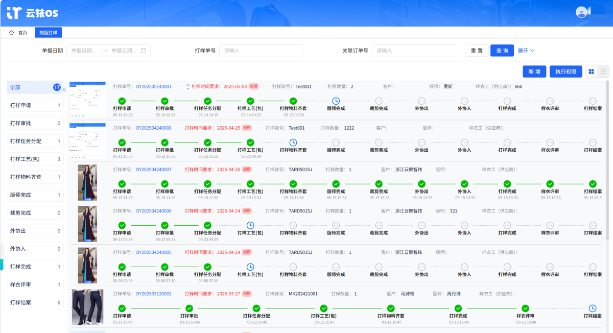 云聚智铱“服装数字版房”系统制版打样管理界面。