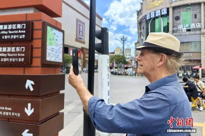 图为一名“洋景漂”用手机扫描旅游导视标牌上的“洋景漂”服务直通车二维码。景德镇市珠山区融媒体中心 供图