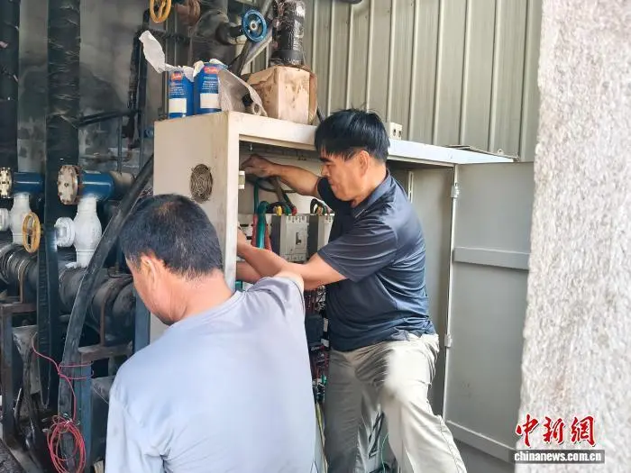8月7日,河北省承德市兴隆县六道河镇一受灾食品生产加工企业正维修冷库设备。受强降雨影响,兴隆县六道河镇部分村受灾,一些道路和房屋损毁。随着灾后恢复重建工作的有序推进,部分受灾企业开始有序恢复生产。王夏菲 摄
