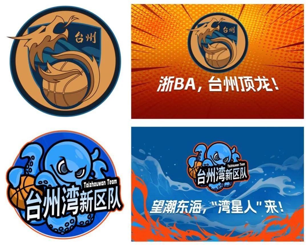 台州湾新区不愧是新区,队旗队徽和口号的设计新潮又新鲜。这只“望潮”章鱼一看就自信满满、骁勇善战(还很好吃的样子)。这么多触手加持,相信湾星人一定会把篮球牢牢掌握在手中,拿捏!