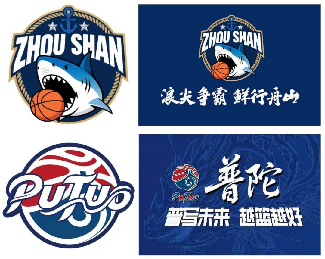 普陀和舟山不约而同选择了象征着大海的深蓝色系,灵动的波浪线条传递出海岛的活力。浪花之上,红色篮球条纹状与熊熊烈火相融。而队旗底纹中加入了东海龙族,低调又不失霸气。