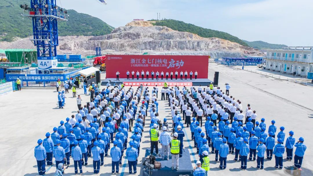 连绵起伏的浪潮与轰鸣不绝的机械交织成奋进的乐章。8月10日上午,位于象山县鹤浦镇的浙江金七门核电项目一期工程现场,各种机器设备和车辆人员正专注而忙碌着,1号机组核岛筏基第一罐混凝土开启浇筑,标志着核电站主体工程从前期准备进入了土建施工阶段。