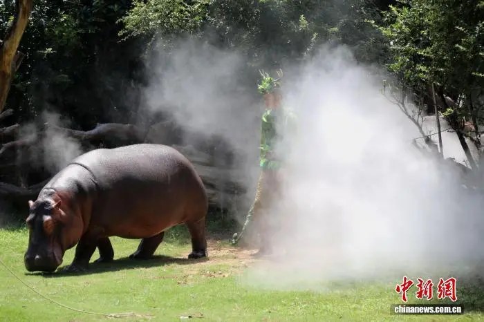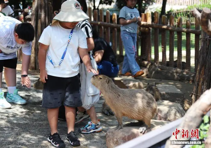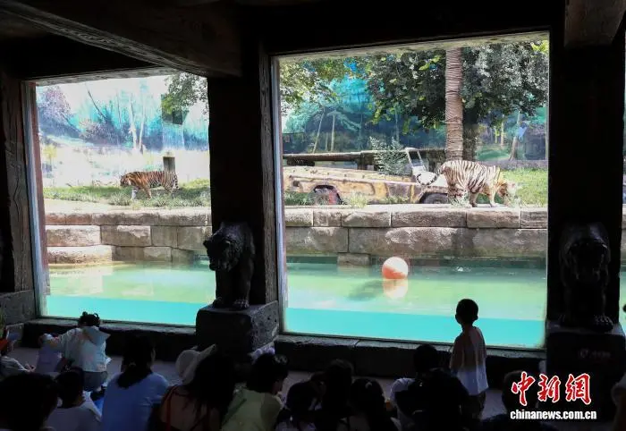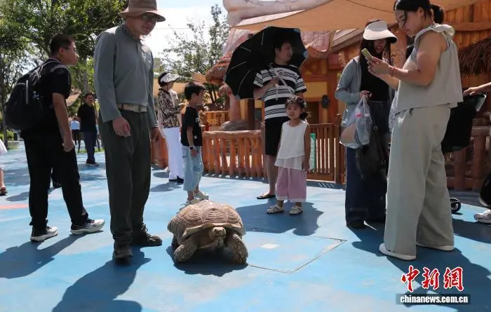 8月11日,正值暑期,河南新密银基动物王国内游人如织。众多亲子家庭走进园区,让小朋友与多种温驯动物近距离接触,感受人与自然和谐相处。图为工作人员带龟上班引游客驻足。王中举 摄