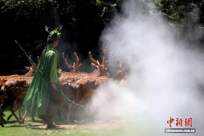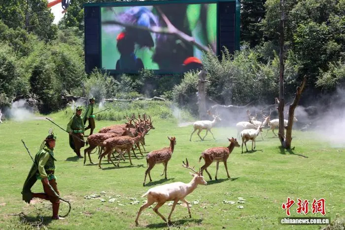 图为工作人员带领梅花鹿登台表演。王中举 摄
