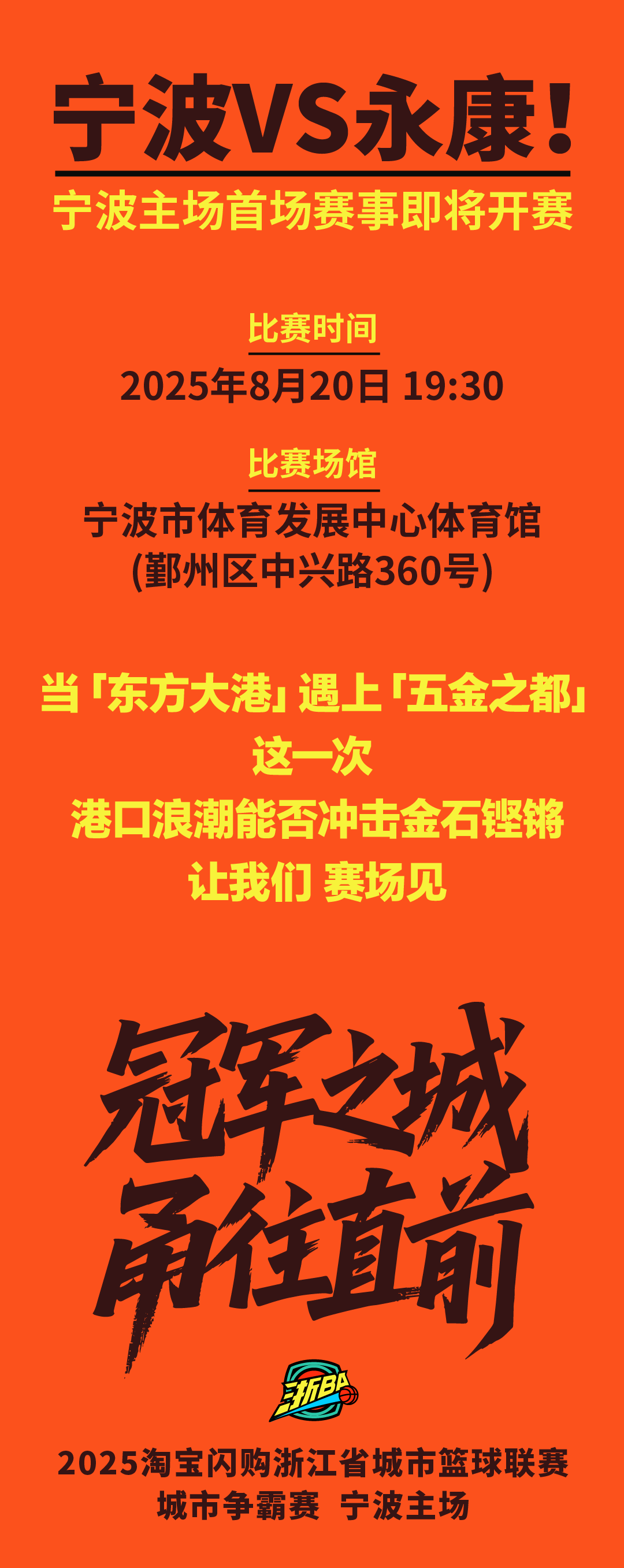 8月13日晚,2025浙江省城市篮球联赛(简称“浙BA”)城市争霸赛宁波队、余姚队出征仪式在宁波市体育发展中心体育馆举行,宣布“NB战队”正式出征。