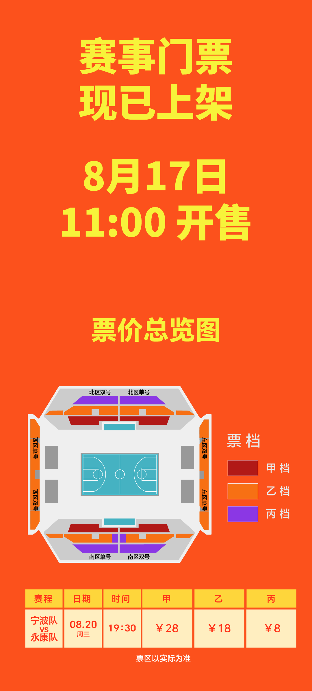 此外,余姚队将于8月17日出征,客场迎战金华队。这场在金华市体育中心体育馆举行的比赛,开票时间为8月15日12:00,票价同样分为三档,分别为28元、18元、8元,售票平台也是大麦网。