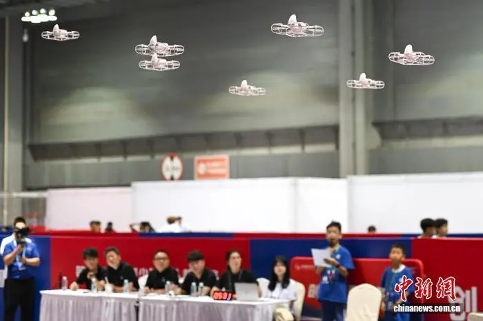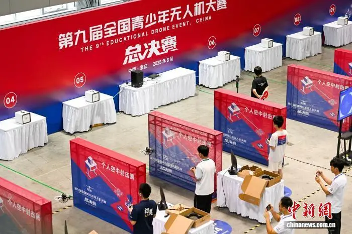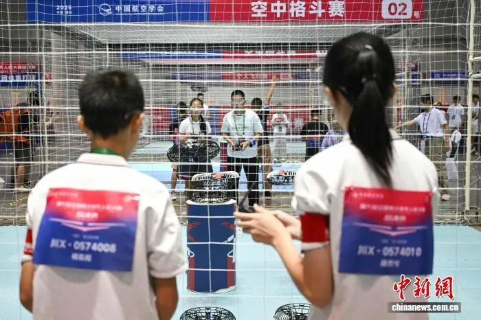 8月15日,2025中国航空航天科普大会暨第九届全国青少年无人机大赛总决赛在重庆开幕。大赛吸引了约15万名选手报名,经层层选拔,来自全国32个省区市及港澳地区近6000所学校的约1.7万名参赛选手脱颖而出,进入总决赛。总决赛设5大类、24个赛项,涵盖无人机射击、图形编程、对抗运动等方面,涉及诸多前沿领域。图为选手在空中足球赛比赛中。中新社记者 何蓬磊 摄