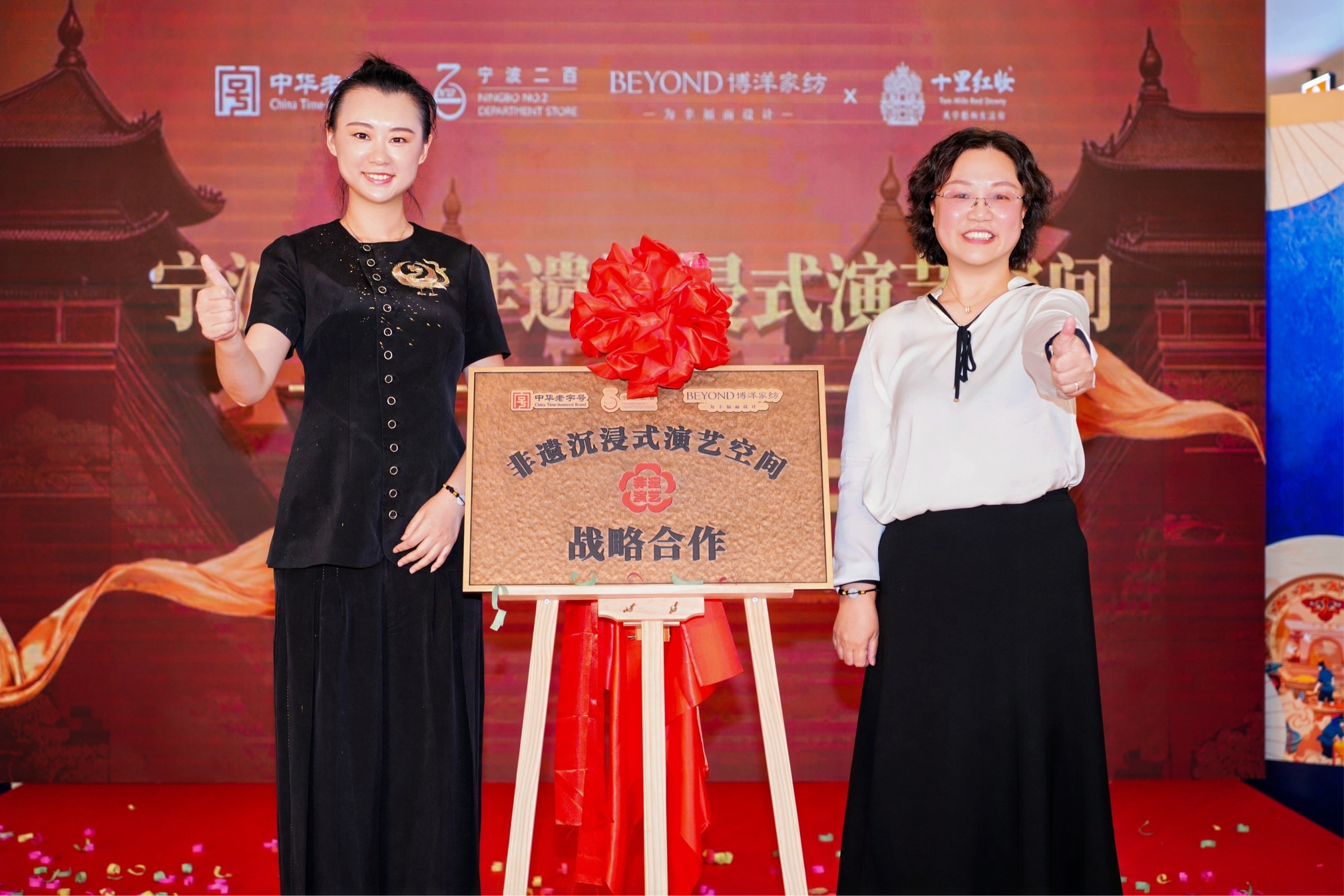 活动中,宁波二百正式授予博洋家纺“非遗沉浸式演艺空间展战略合作单位”称号。宁波中百股份有限公司董事、宁波二百总经理俞建雅女士为博洋家纺品牌负责人潘娜女士授予牌匾。这一举措不仅是对博洋家纺的高度认可,更标志着宁波二百“非遗沉浸式演艺空间”将以“每月18日”为约定,系列化、常态化地邀请商场的老字号品牌供应商加入,通过签署战略合作协议,共同打造非遗与商业融合的新场景。