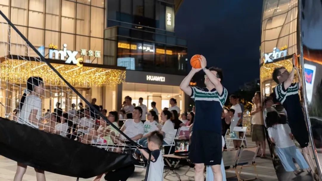 在宁波万象汇首层中庭区域的NIKE篮球体验区,宽191厘米、高110厘米的高清大屏幕直播着“浙BA”赛事,现场聚集了大批球迷与消费者。