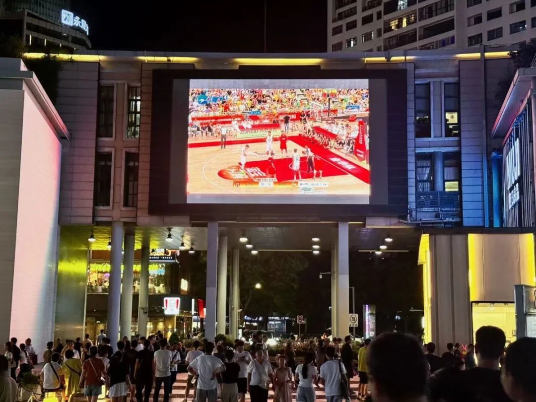 刚刚过去的周末,天一广场中心广场高耸的巨型LED大屏成为“浙BA”赛事直播的视觉中枢:赛事精彩瞬间通过巨幕实时呈现,整个广场瞬间化身激情四溢的露天观赛场所。