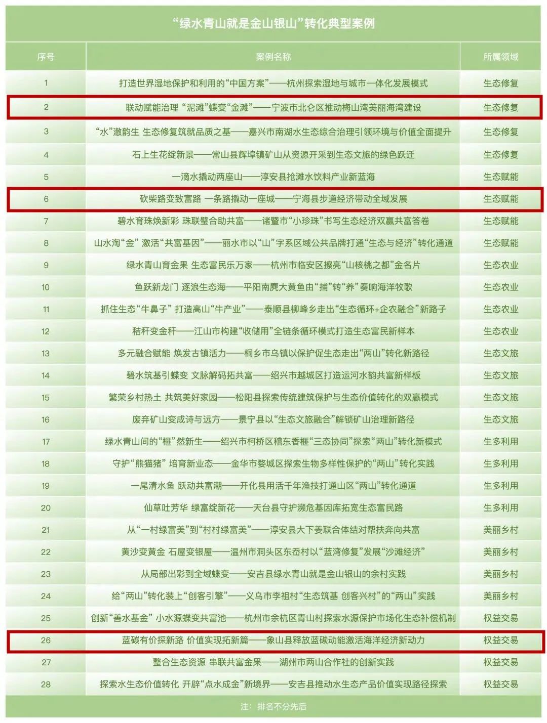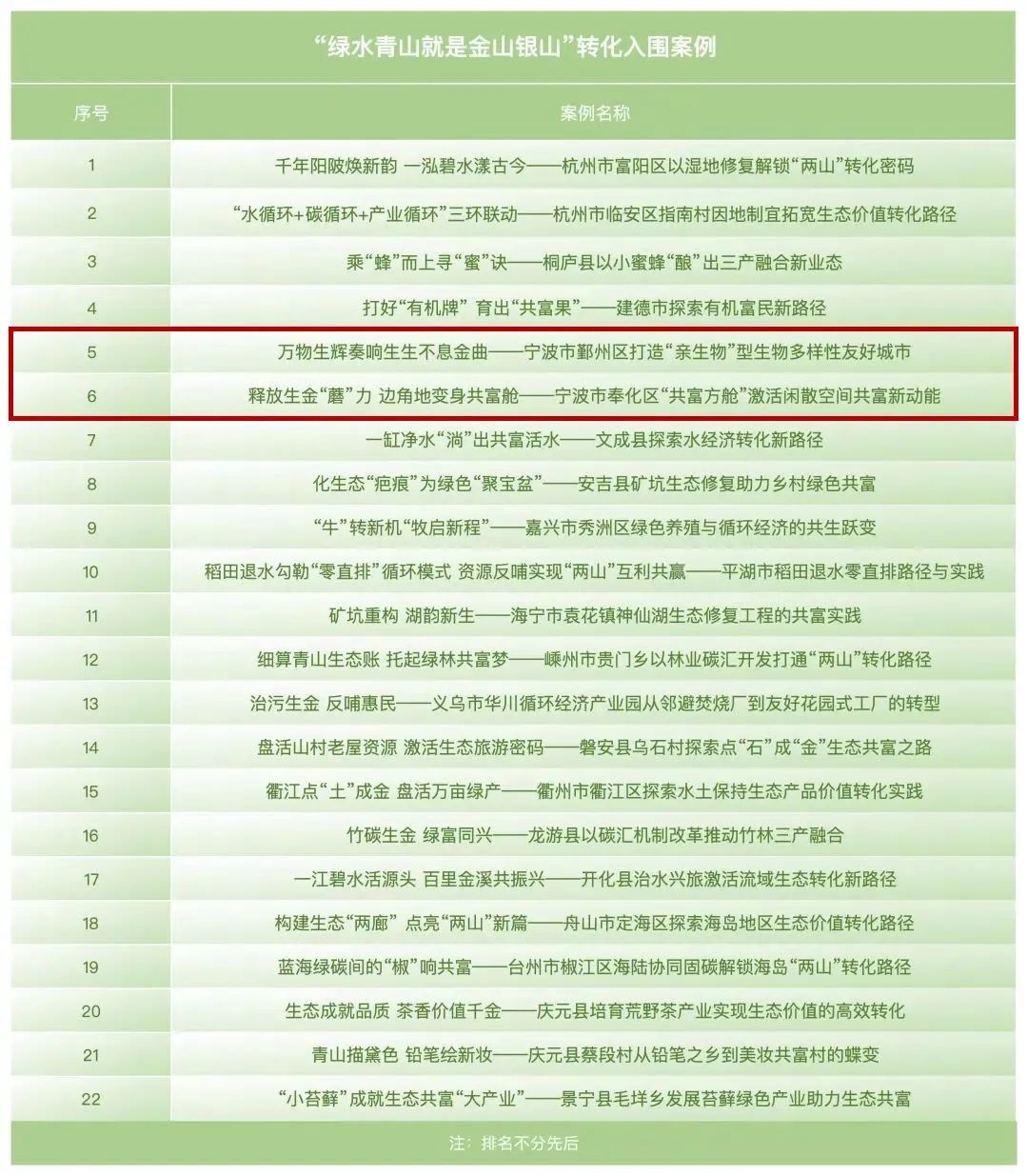 其中,“绿水青山就是金山银山”转化典型案例中,宁波有3个入选,“绿水青山就是金山银山”转化入围案例中,宁波有2个入选。