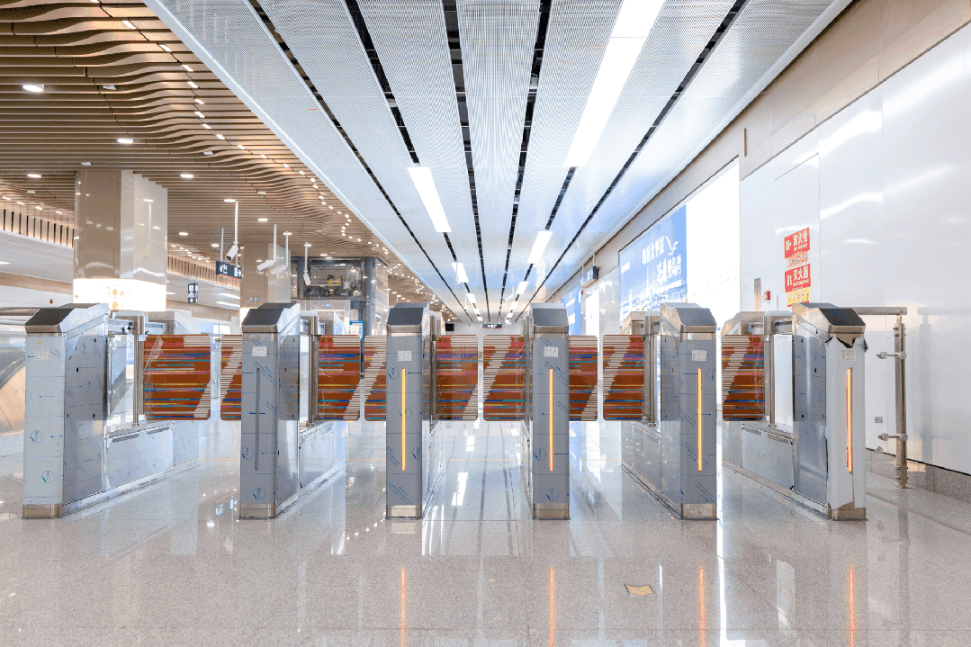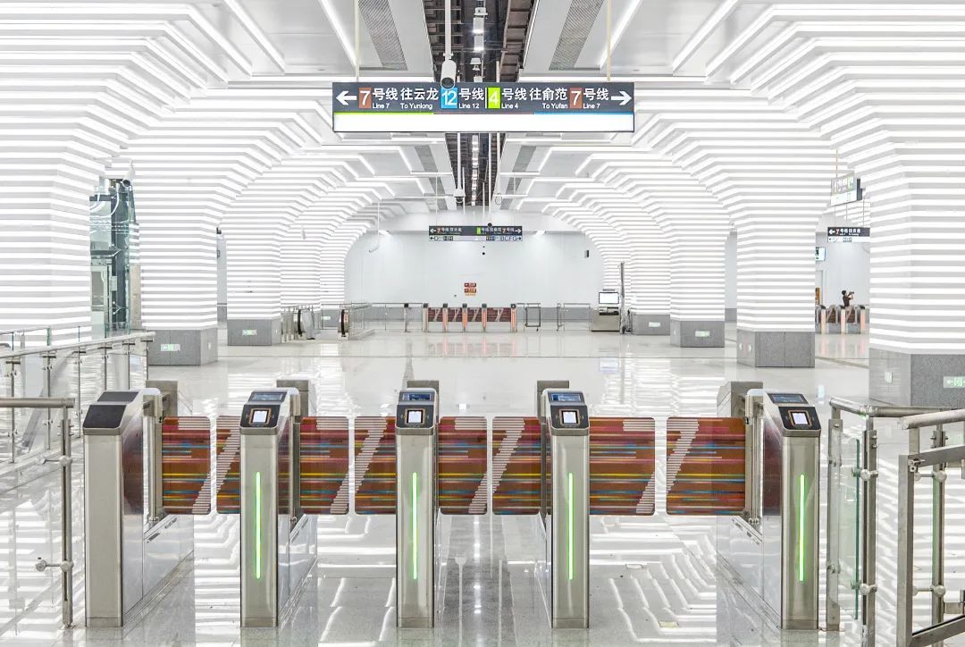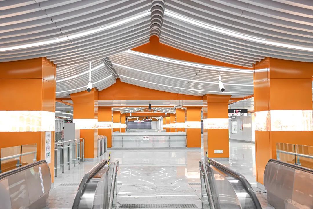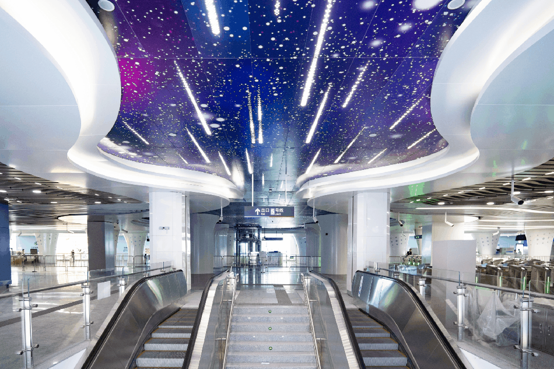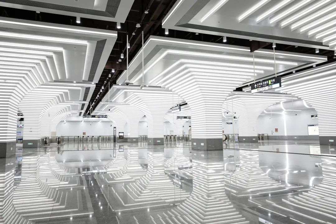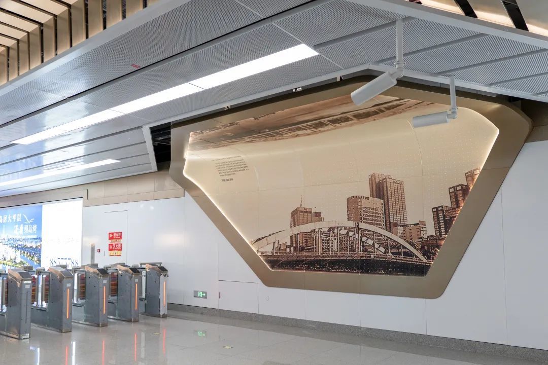 小洋江站以“星河五洲”为主题,运用“桥拱”造型,与水、浪、古建筑等元素相融。