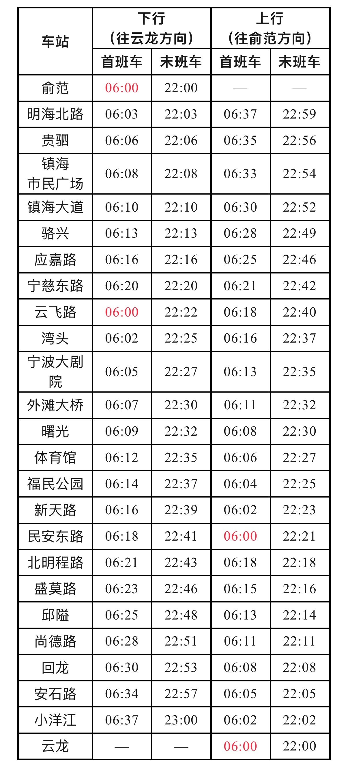 首末班车时刻表