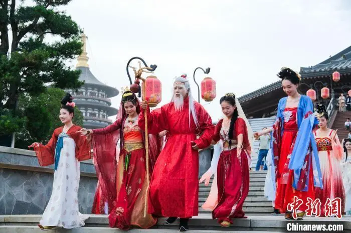 资料图:中国传统节日七夕节,河南隋唐洛阳城景区“月老”牵红线活动吸引游客关注。图为“月老”和“神都仙女团”准备向游客赠送祝福。牛林林 摄