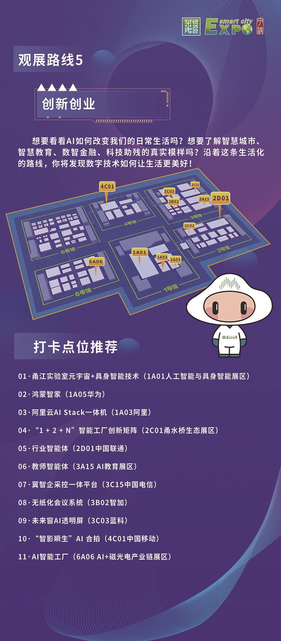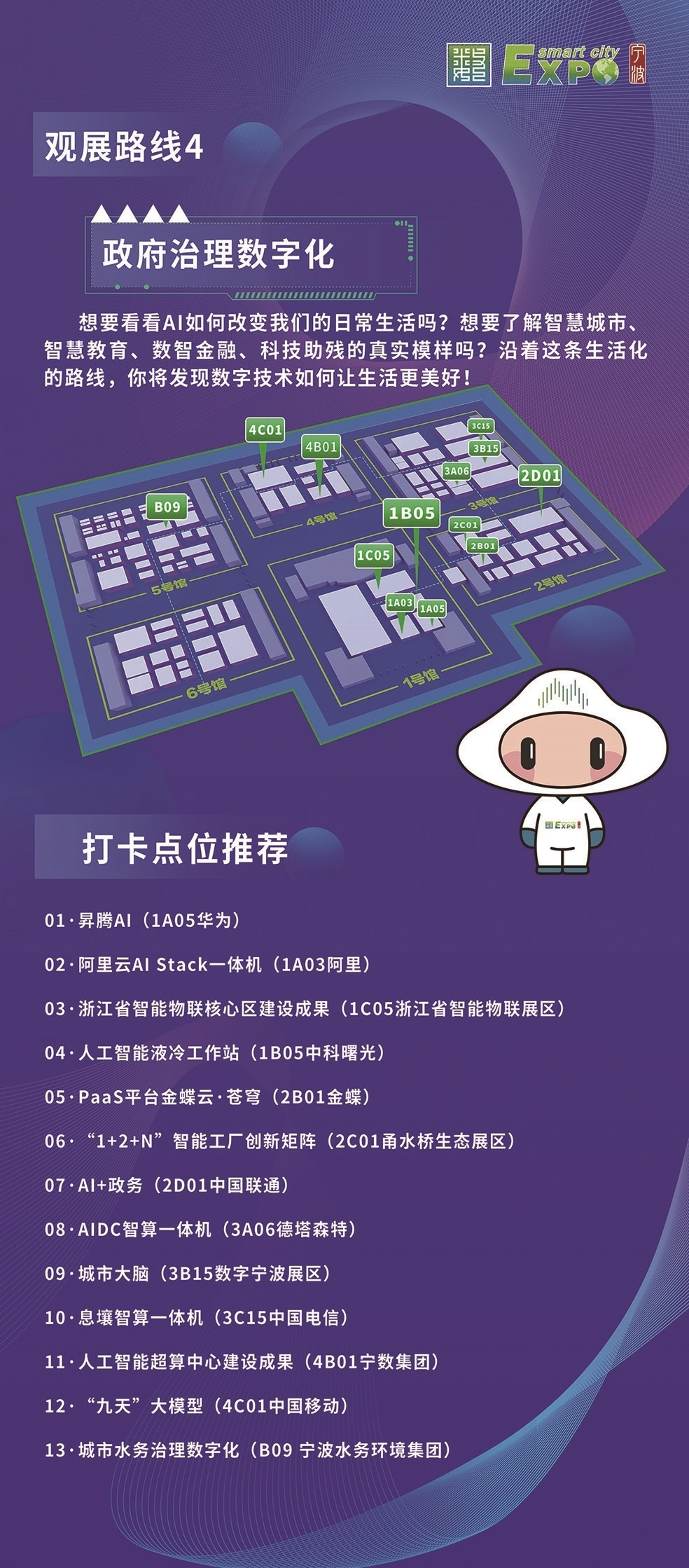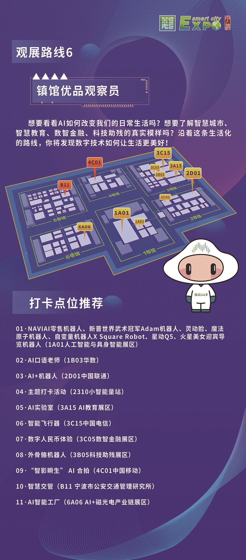 组委会特别为观众设计了六条特色观展线路——“人工智能与具身智能”“数智应用场景”“制造业数字化转型”“政府治理数字化”“创新创业”“镇馆优品观察员”。