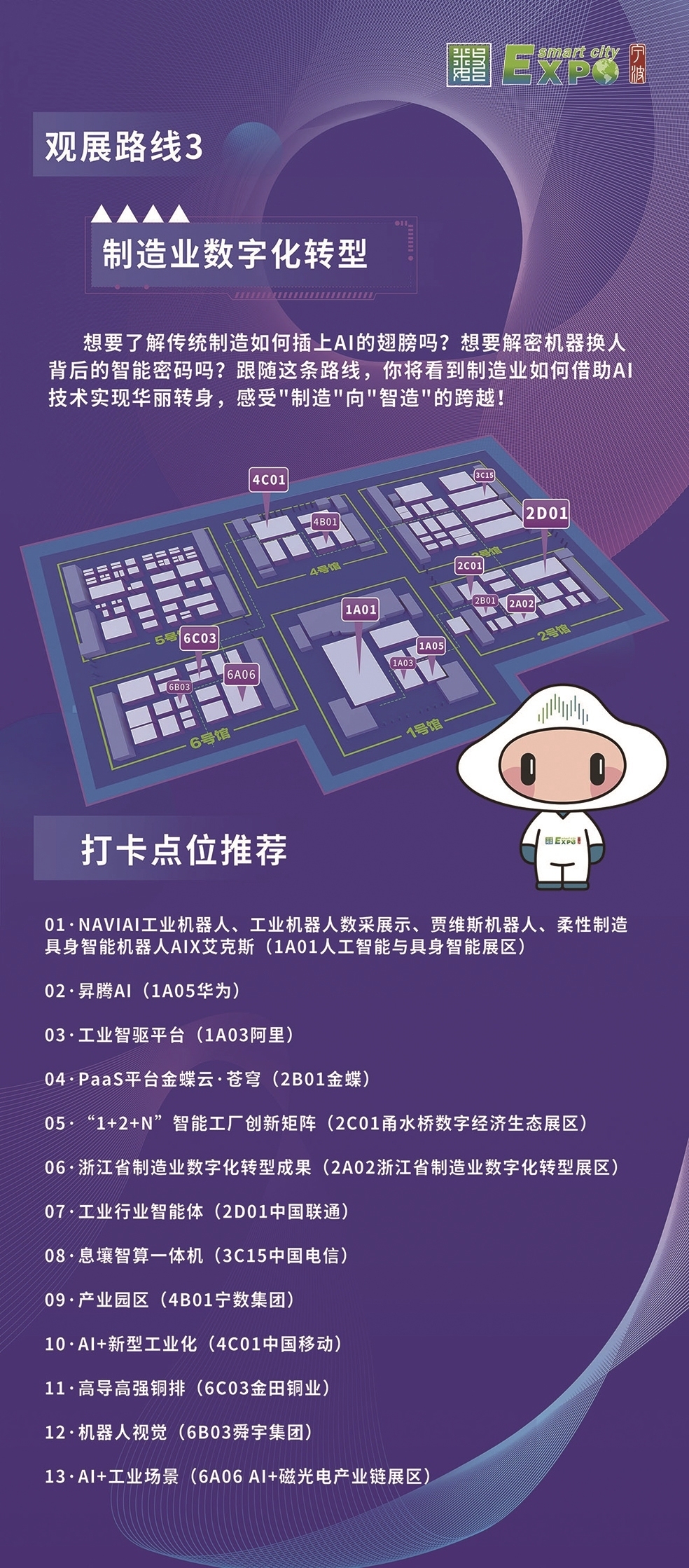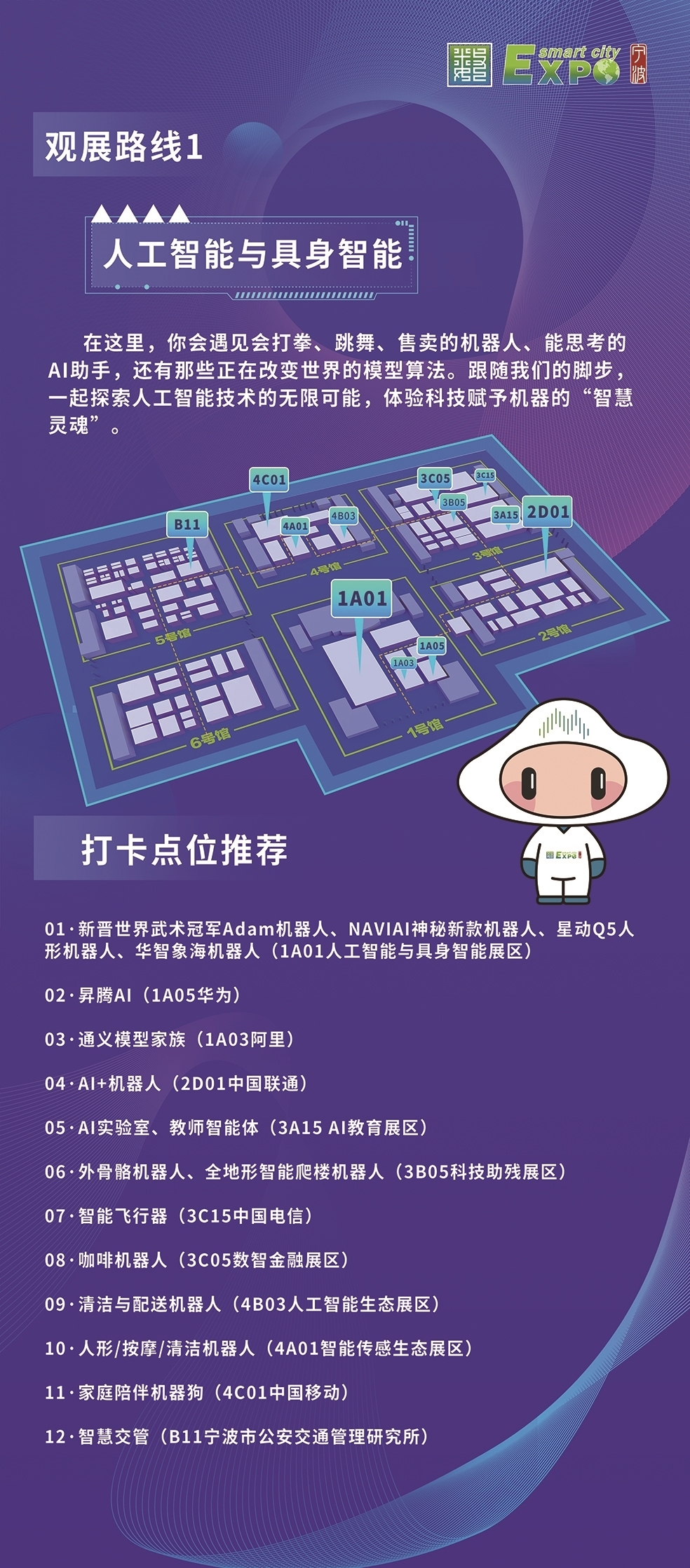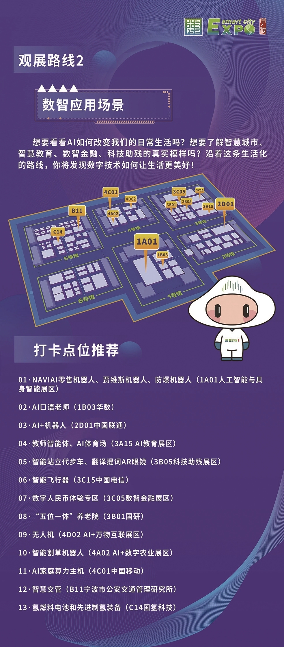 组委会特别为观众设计了六条特色观展线路——“人工智能与具身智能”“数智应用场景”“制造业数字化转型”“政府治理数字化”“创新创业”“镇馆优品观察员”。
