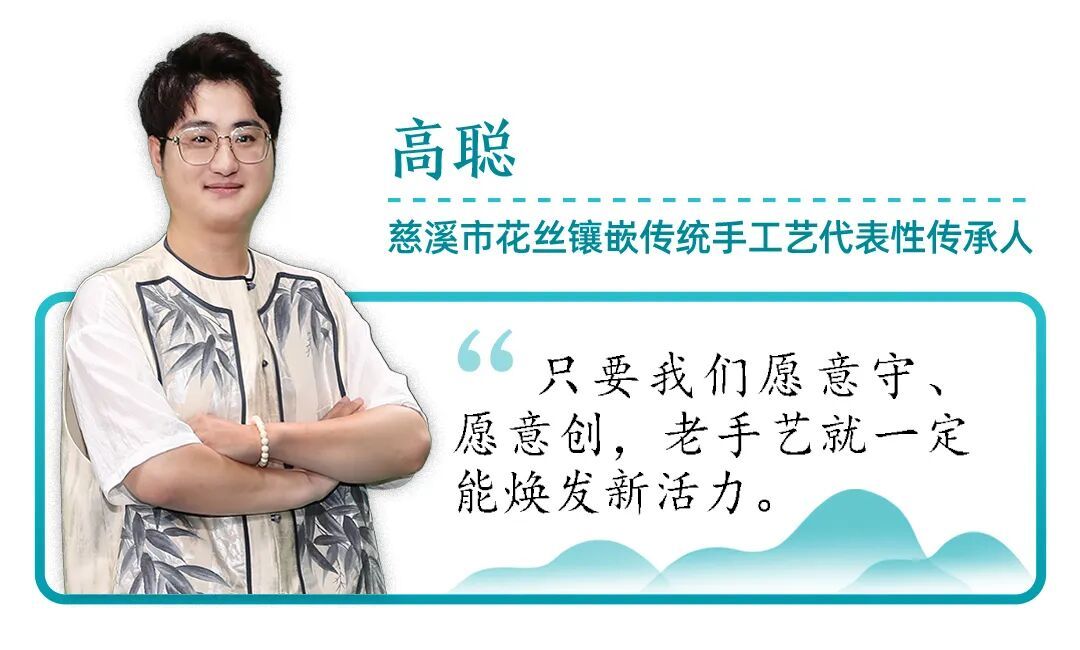 他不仅致力于复刻文物,更推动花丝镶嵌技艺走向日常生活。他与团队开发的“翠屏幽兰”车载香薰等产品一经推出便迅速售罄,备受市场欢迎。此外,他还创新性地将花丝镶嵌与慈溪越窑青瓷相结合,创作出胸针、发簪等一系列新品,为传统工艺注入现代活力。