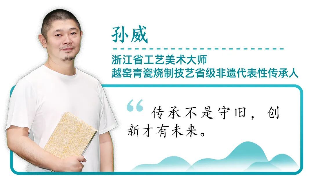 孙威与青瓷的缘分,始于他身为瓷匠的父亲孙迈华。在父亲的影响下,孙威大学毕业后来到慈溪,全身心投入到越窑青瓷的研究与烧制工作中。经过无数次艰苦试验,他与团队最终成功烧出已失传千年的秘色瓷,让那份“夺得千峰翠色来”的诗意得以再现于世。2011年,在多方的共同努力下,越窑青瓷烧制技艺成功申报为国家级非物质文化遗产。
