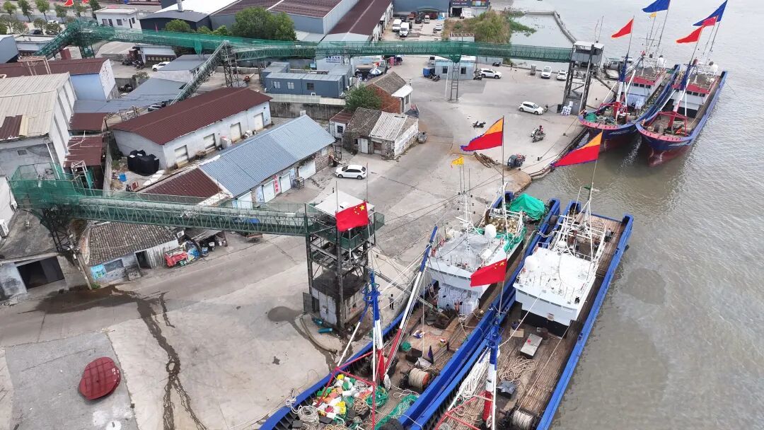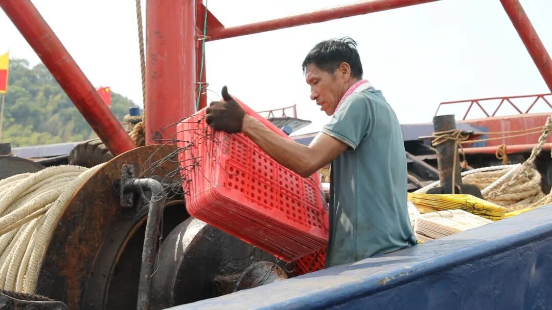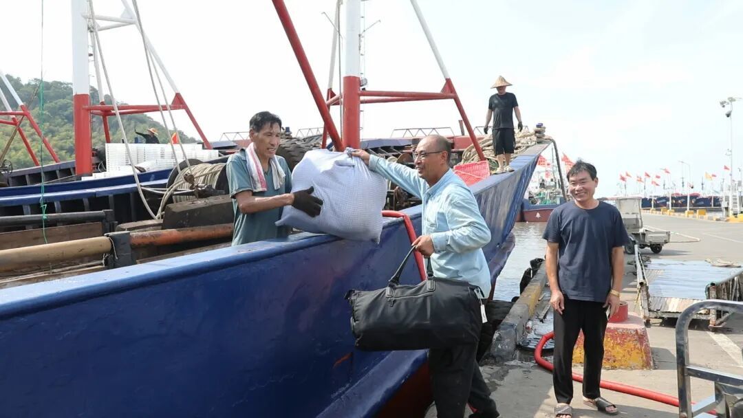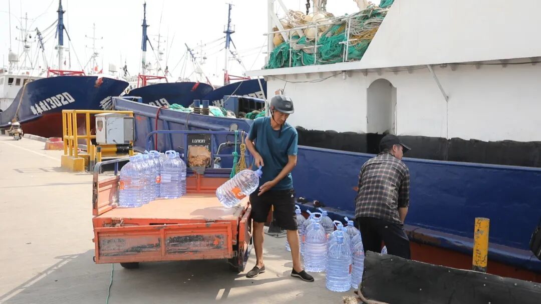 在桐照渔港,数百艘渔船整齐列阵,渔民们穿梭在甲板间,将饮用水、粮油等物资快速搬运上船。