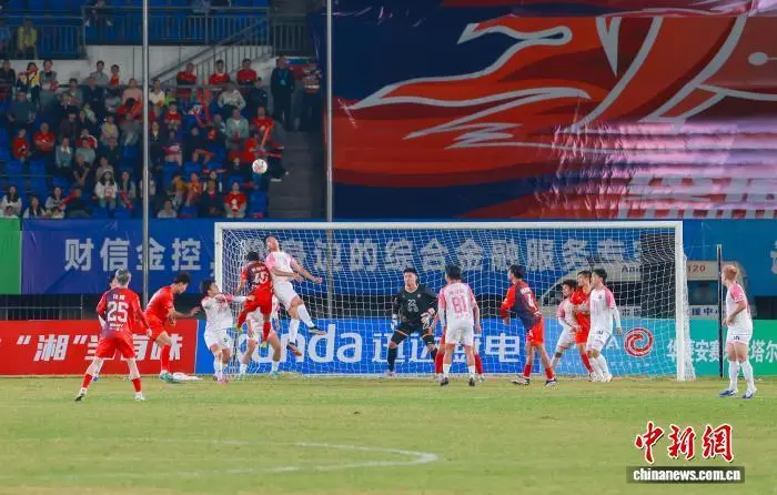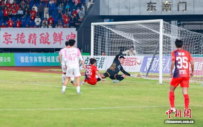 9月20日晚,“湘超”常德队客场对阵主队娄底队,21000余名球迷现场为两队摇旗助威。依靠26号球员夏宇航的进球,常德队1比0击败娄底队,取得两连胜。图为常德队门将王峰琦(右二)扑出一记极具威胁的射门。 蔡文龙 摄