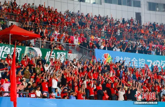 9月20日晚,“湘超”常德队客场对阵主队娄底队,21000余名球迷现场为两队摇旗助威。依靠26号球员夏宇航的进球,常德队1比0击败娄底队,取得两连胜。图为观众在现场加油。 蔡文龙 摄