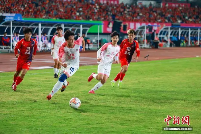 9月20日晚,“湘超”常德队客场对阵主队娄底队,21000余名球迷现场为两队摇旗助威。依靠26号球员夏宇航的进球,常德队1比0击败娄底队,取得两连胜。图为常德队19号球员王骞弘抢球。 蔡文龙 摄