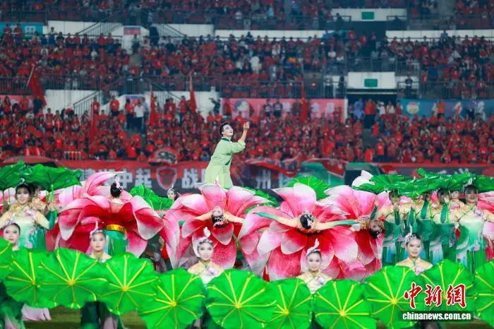 9月20日晚,“湘超”常德队客场对阵主队娄底队,21000余名球迷现场为两队摇旗助威。依靠26号球员夏宇航的进球,常德队1比0击败娄底队,取得两连胜。图为开场表演。 蔡文龙 摄