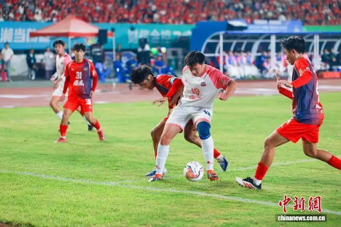 9月20日晚,“湘超”常德队客场对阵主队娄底队,21000余名球迷现场为两队摇旗助威。依靠26号球员夏宇航的进球,常德队1比0击败娄底队,取得两连胜。图为比赛中双方队员展开激烈对抗,背靠背争抢球权。 蔡文龙 摄