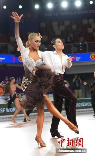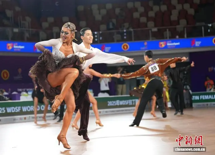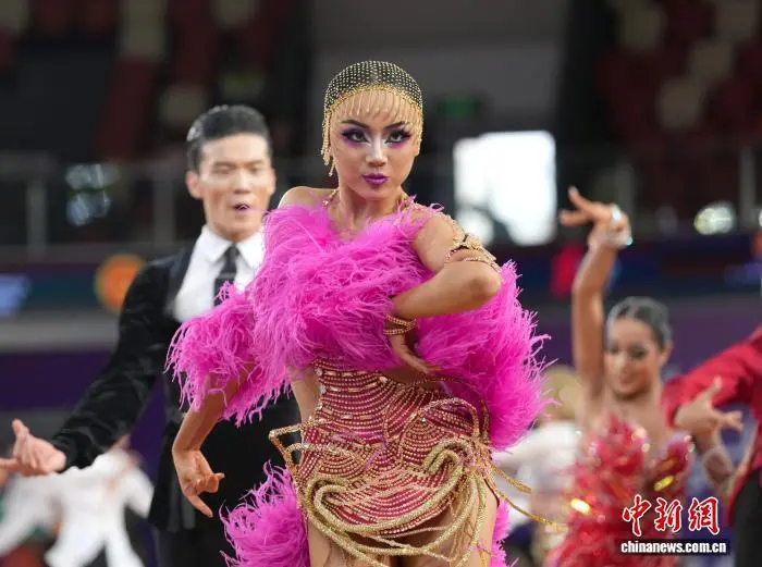 9月21日,2025WDSF青年组世界公开赛——拉丁舞比赛在四川成都举行,24对选手参与角逐,在赛场尽展舞姿。图为拉丁舞比赛现场。中新社记者 安源 摄