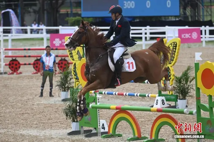 9月21日,第十五届全运会现代五项比赛男子个人决赛(老五项)在广东省黄村体育训练中心开赛,湖北选手陈柏良夺得冠军,上海选手李刘畅获得亚军,内蒙古选手刘振峰获得季军。老五项沿用传统组合,即马术、击剑、游泳与激光跑(跑射联项)。图为上海选手罗帅参加马术比赛。中新社记者 陈楚红 摄