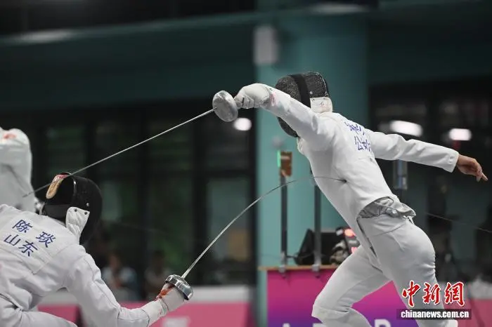 9月21日,第十五届全运会现代五项比赛男子个人决赛(老五项)在广东省黄村体育训练中心开赛,湖北选手陈柏良夺得冠军,上海选手李刘畅获得亚军,内蒙古选手刘振峰获得季军。老五项沿用传统组合,即马术、击剑、游泳与激光跑(跑射联项)。图为山东选手陈琰(左)在击剑比赛排名第一。中新社记者 陈楚红 摄
