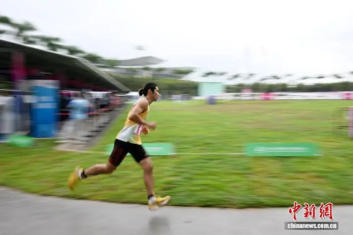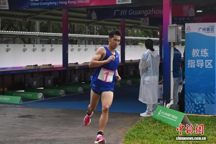 9月21日,第十五届全运会现代五项比赛男子个人决赛(老五项)在广东省黄村体育训练中心开赛,湖北选手陈柏良夺得冠军,上海选手李刘畅获得亚军,内蒙古选手刘振峰获得季军。老五项沿用传统组合,即马术、击剑、游泳与激光跑(跑射联项)。图为上海选手李刘畅参加激光跑比赛。中新社记者 陈楚红 摄