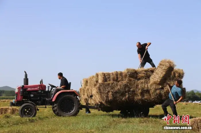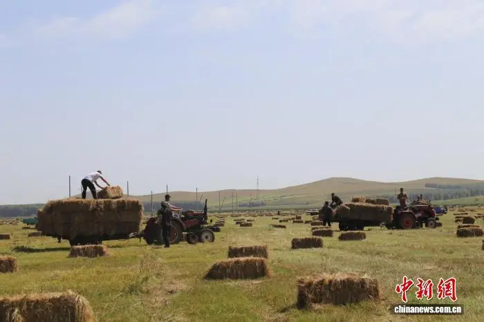 图为牧民们正在将收割的牧草装上车。 白玉亮 摄