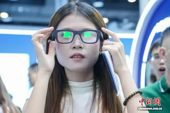 图为参观者试戴一副具备实时翻译、提词等功能的智能眼镜。中新社记者 陈冠言 摄