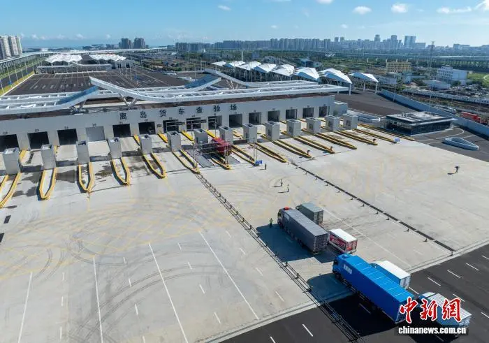 图为出岛货车通过海口新海港和南港“二线口岸”(货运)集中查验场。 中新网记者 骆云飞 摄