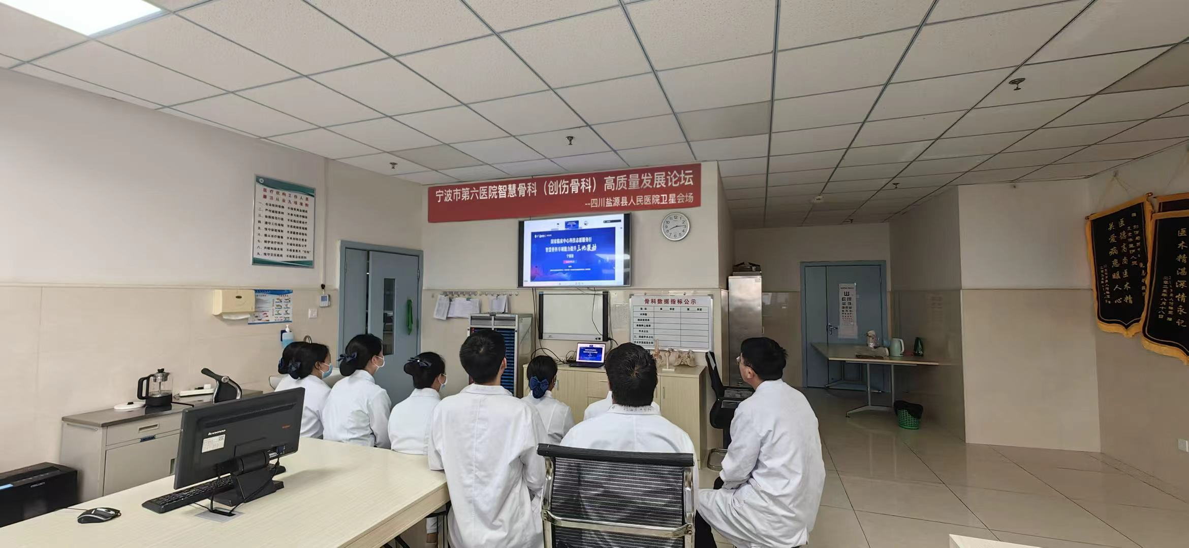 活动当天上午,在盐源县人民医院骨科会议室里,气氛热烈。医生们齐聚一堂,目不转睛地收看来自宁波第六医院的手术直播。屏幕中,中国人民解放军总医院与宁波市第六医院手术专家团队强强联合,中国人民解放军总医院郝明教授在智能导航辅助下,行云流水般完成胫骨骨折治疗以及股骨转子间骨折手术,并面向全国进行实时直播。同时,主会场与盐源、库车分会场通过线上转播展开互动交流,跨越山海的距离。三地的骨科专家们共同探讨智慧骨科领域的热点与难点问题,分享经验与见解,碰撞出思维的火花。