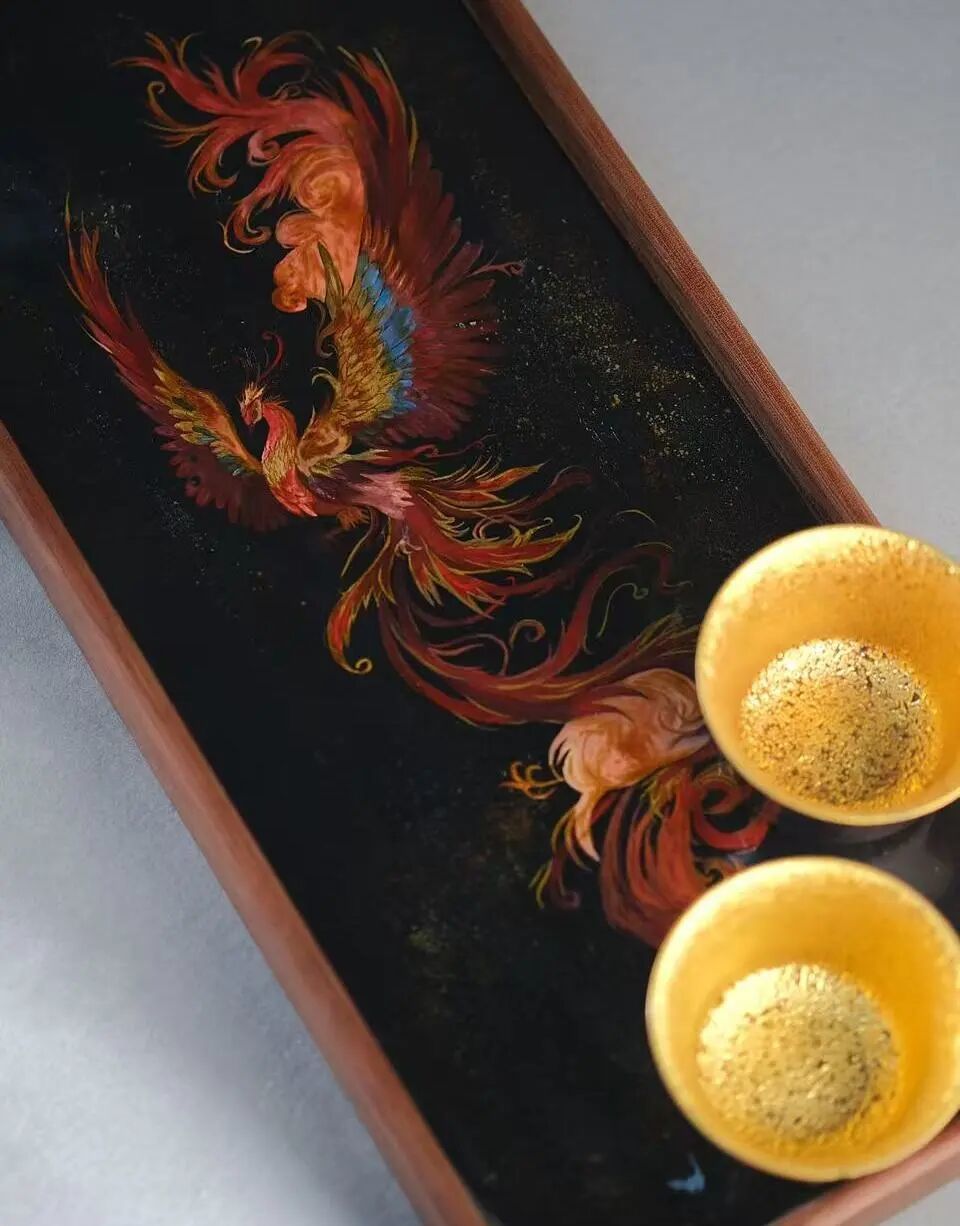 大漆金杯以中国传统大漆工艺为底蕴,融合龙凤图腾这一经典文化符号,传递“龙凤呈祥”的美好寓意。龙象征权威与力量,凤代表祥瑞与和谐,二者交织于杯身,既彰显东方美学的庄重华贵。