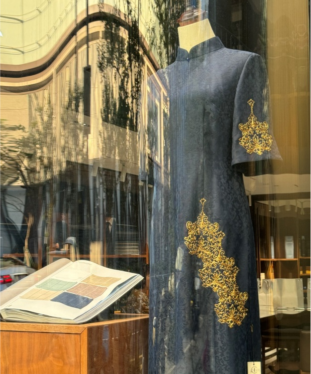 以宁波城市文旅口号为灵感,沿用红帮裁缝量身定制工艺,融合香云纱非遗面料,以金银彩绣手工刺绣“缠枝莲”等传统吉祥纹样,寓意“生生不息、欢喜和合”;配饰单品则以宁波地域文化故事为主题,以手工盘扣制作技艺设计推出《欢喜奉桃》《吉祥福蛇》等胸针。