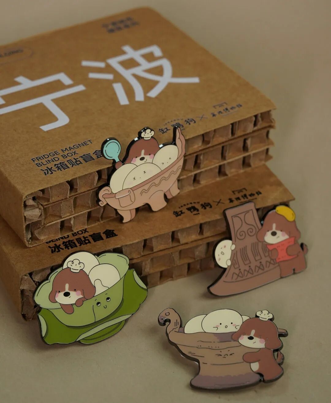 该系列冰箱贴旨在将非遗文化和宁波历史以年轻化、趣味化的方式活化宁波博物馆的珍贵馆藏文物。核心设计理念是将宁波深厚的历史文化底蕴与代表宁波汤圆的本土知名美食品牌“缸鸭狗”的现代IP形象(阿狗)及标志性产品(汤圆)进行巧妙融合。通过这种跨界联名,让严肃的文物“活”起来