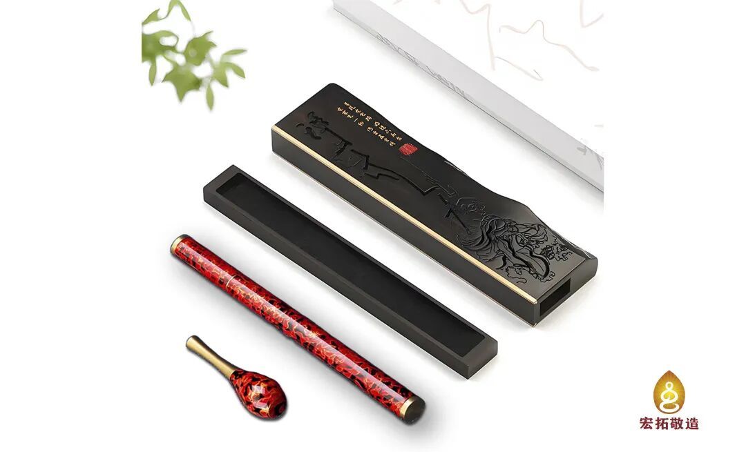 以“器载道,漆承韵”为理念,融合失蜡浇铸与脱胎漆器两项非遗工艺。炉体线条浑厚简朴,錾刻禅纹,香霭氤氲。香管花器历经数十道大漆工艺,墨朱流霞,温润如玉。套装集焚香、插花功能于一体,为书房、茶室营造一方禅意空间,于袅袅烟云中引领静心之境,体悟东方生活美学。