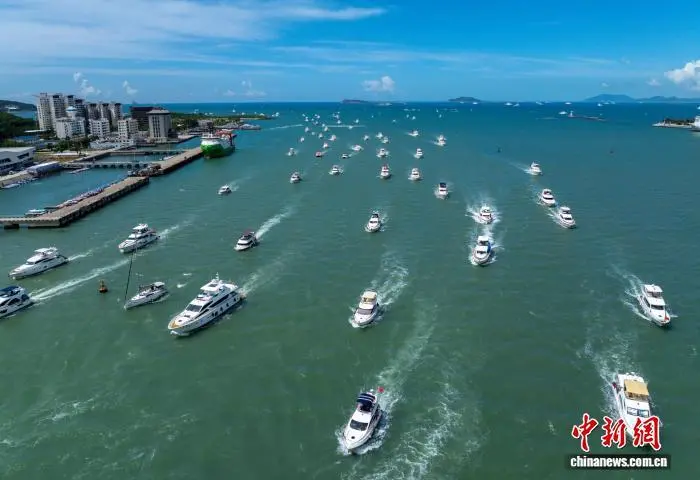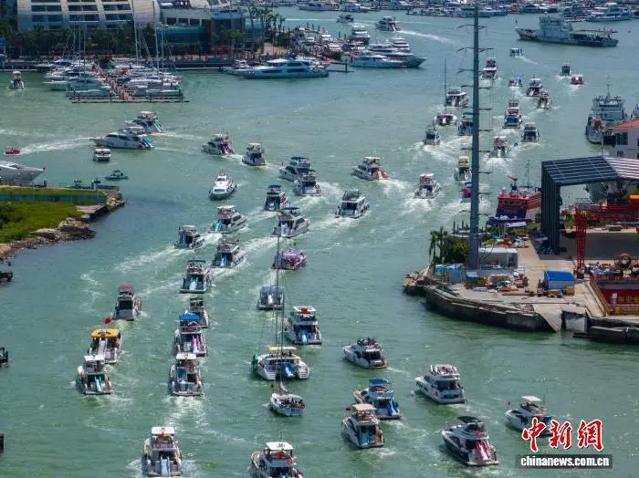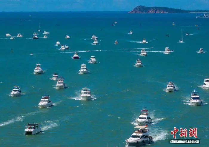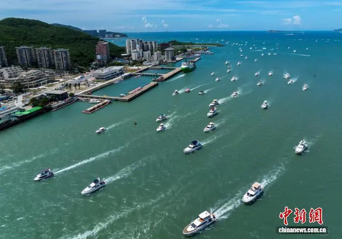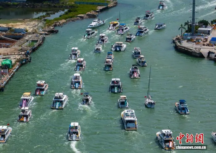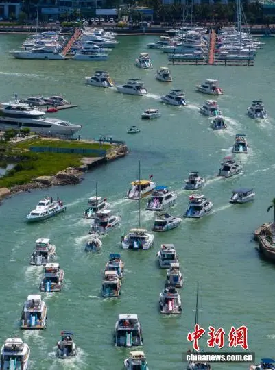 图为一艘艘游艇载着游客有序进港。(无人机照片)中新社记者 骆云飞 摄