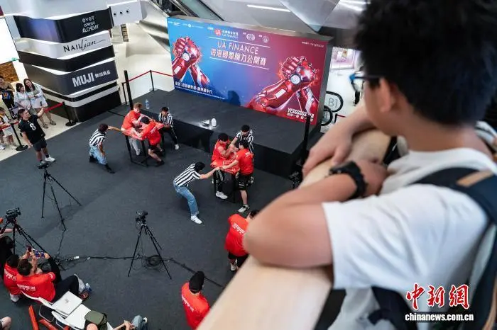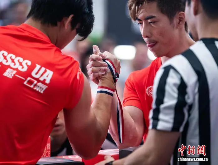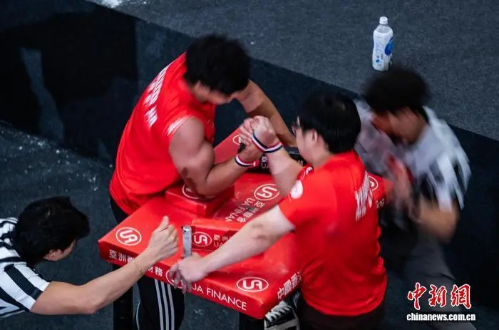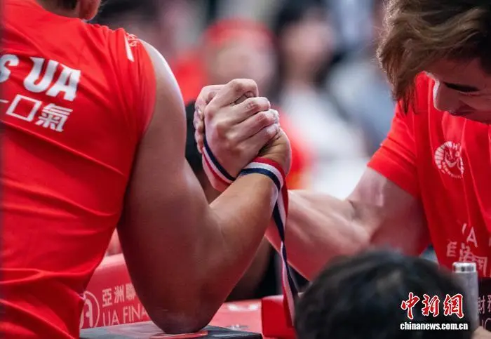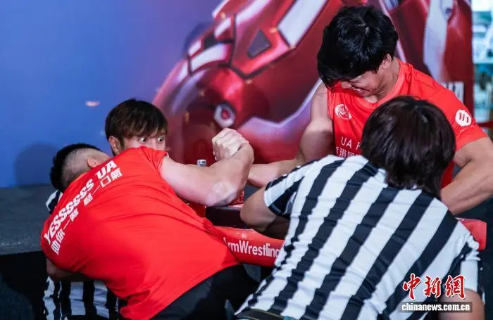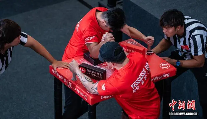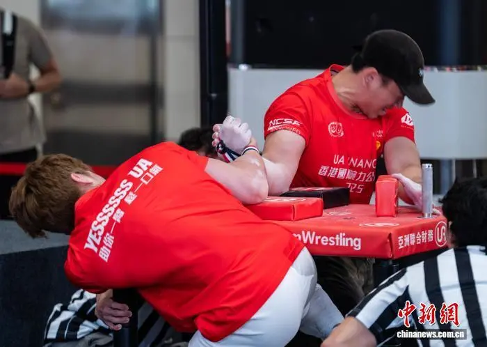 10月11日,由中国香港腕力运动总会举办的“中国香港国际腕力公开赛2025”在尖沙咀一家商场开赛。该赛事获世界腕力协会(WAF)认可,参赛选手在三个男子重量级别组 、女子无重量限制公开组和首次设置的男子大专中学生无重量限制组中比试手腕的力量。图为两名参赛选手在男子80公斤以下级比赛中一较高下。中新网记者 侯宇 摄