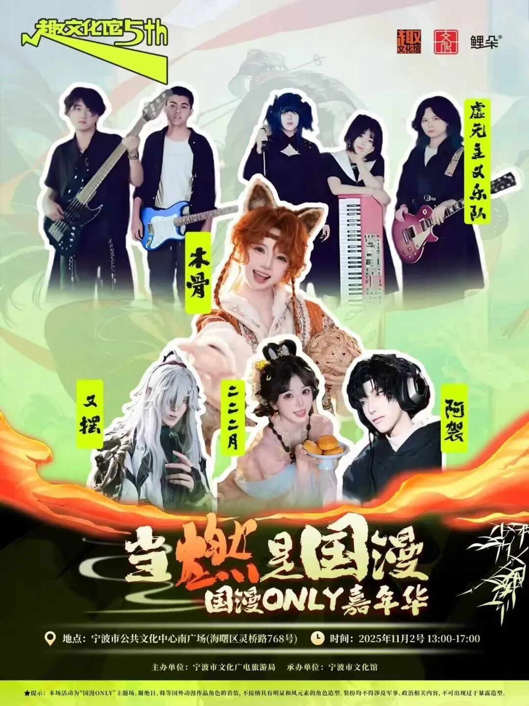 这场狂欢的压轴大戏,留给热爱国漫的你!宁波市公共文化中心南广场变身二次元乐园:谷子展售区藏着心动周边,ACG乐队现场炸场,随机舞蹈等你来“贴贴”,更有知名Coser木骨、二月亲临互动。