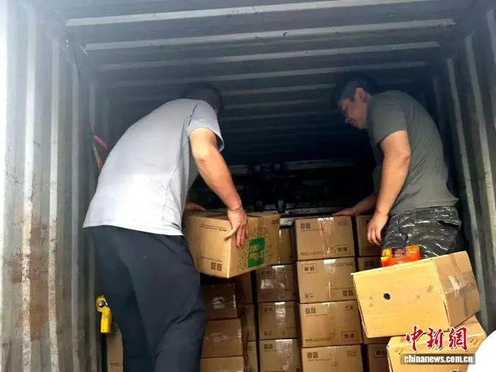 工人们将一箱箱黄牛肉产品搬上发往北京、广州的货车。 汪玉晴 摄
