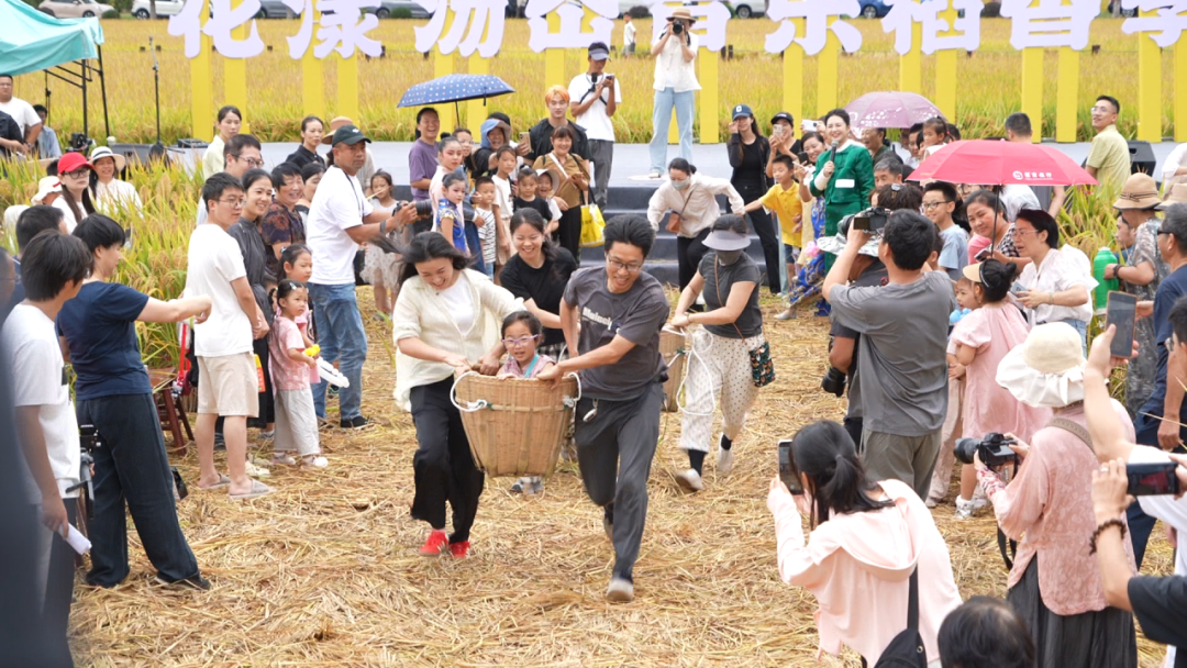 活动现场,农耕体验项目格外引人注目。捣年糕体验区米香四溢,现捣现蒸的年糕让游客们过足了嘴瘾;古法打谷场上,稻穗在脱粒机中颗颗归仓,生动展现着农耕智慧的传承。游客们在亲身参与中,更加体会到“粒粒皆辛苦”的深刻含义。随后的“运粮大赛”将全场气氛推向高潮。家长们将孩子抱进竹筐,抬起并奋力奔向终点,紧张又充满趣味的比赛引得观众笑声、呐喊声不断。
